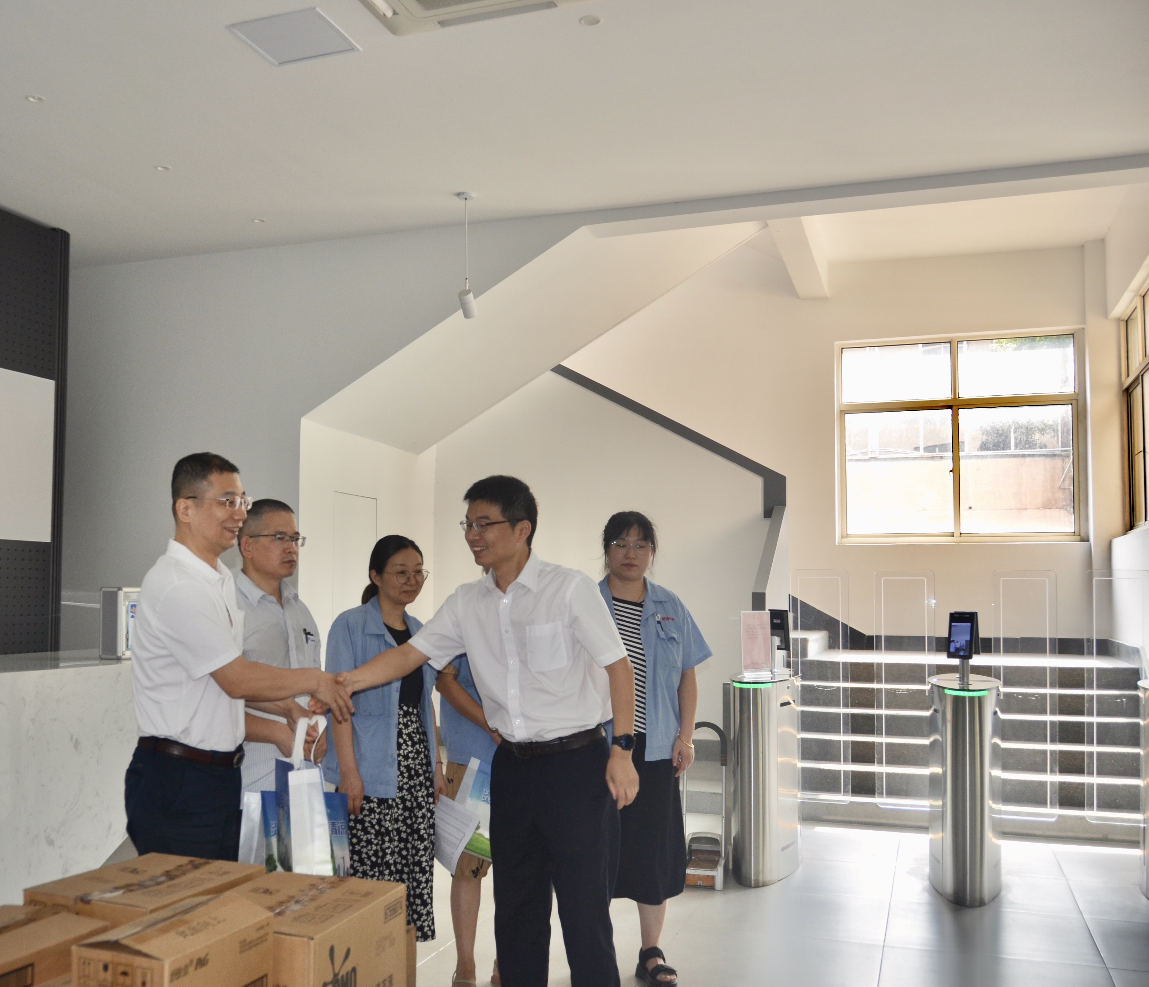 “炎炎夏日送清涼,濃濃關(guān)愛沁人心?!苯?,徐舍鎮(zhèn)黃鎮(zhèn)長(zhǎng)攜鎮(zhèn)總工會(huì)及相關(guān)領(lǐng)導(dǎo)一行來我司開展送清涼活動(dòng),走訪慰問奮斗在高溫崗位的一線員工,為他們送去了防暑降溫用品,讓他們?cè)诳崾钪懈惺艿揭唤z清涼。活動(dòng)中,徐舍鎮(zhèn)相關(guān)領(lǐng)導(dǎo)及工會(huì)向奮戰(zhàn)在一線的勞動(dòng)者表示由衷的感謝和問候,與員工代表們親切交談,叮囑大家注意勞逸結(jié)合,防暑降溫,確保安全生產(chǎn)工作有序進(jìn)行。開展“夏送清涼"的活動(dòng),是工會(huì)關(guān)心職工生活,保障職工權(quán)益的重要舉措,我司把防暑降溫工作作為夏季重點(diǎn)工作來抓。切實(shí)關(guān)心職工身體健康和勞動(dòng)安全。把防暑降溫工作和勞動(dòng)安全保障落實(shí)到各高溫崗位的職工,讓他們?cè)谘籽紫娜崭惺艿轿镔|(zhì)、精神的雙清涼。